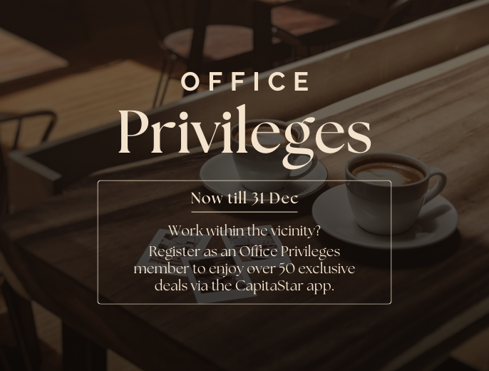 Look forward to work days with our Office Privileges Programme, featuring over 50 exclusive deals on the CapitaStar app. Register as an Office Privileges member if you work within the vicinity!