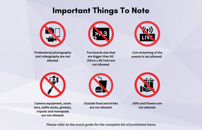 - Ticket holders with prohibited items such as vapes and cameras will be denied entry.