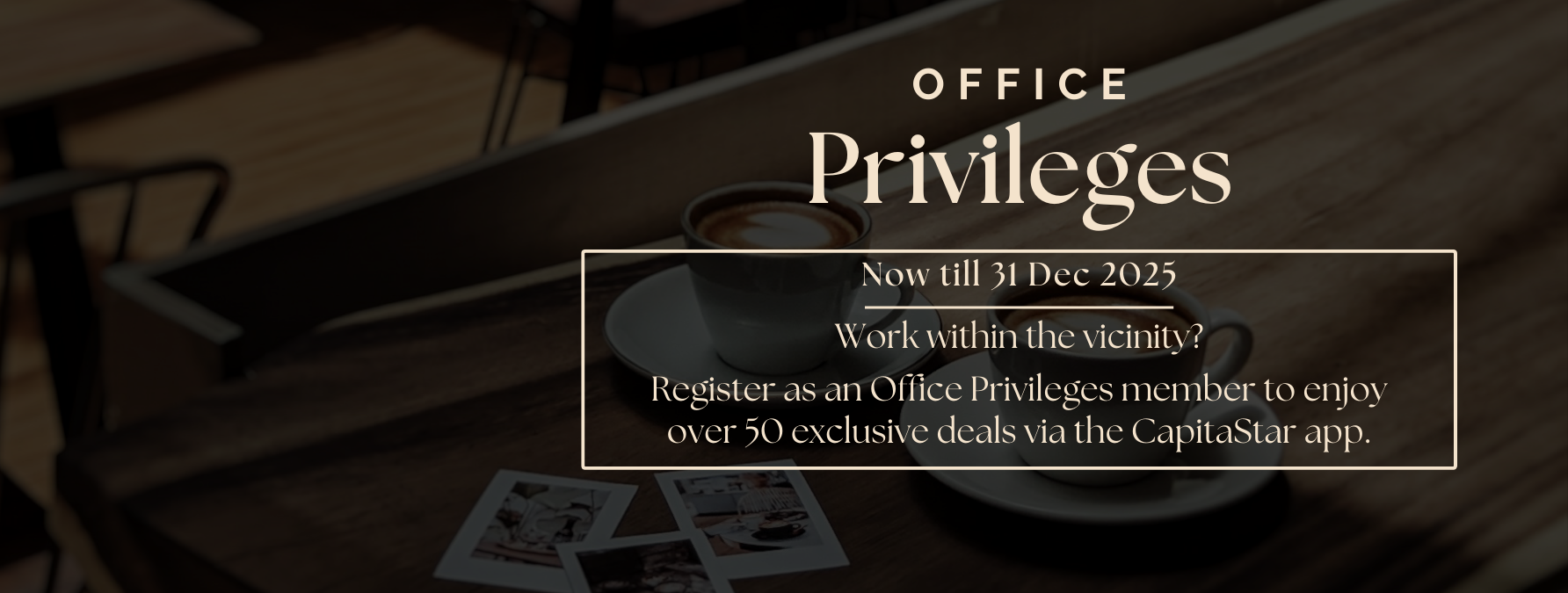 Look forward to work days with our Office Privileges Programme, featuring over 50 exclusive deals on the CapitaStar app. Register as an Office Privileges member if you work within the vicinity!