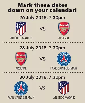 HOT ON THE HEELS of the 2018 FIFA World Cup and just before the start of the 2018/2019 European football season, three of the world’s biggest football clubs, Arsenal, Atlético de Madrid and Paris Saint-Germain, will meet in Singapore for three days of marquee matches. In its sixth edition, the 2018 International Champions Cup takes on a new global format this year. A total of 18 teams will play 27 matches in various venues around the globe. Singapore is the only Asia-Pacific stop. The bestranked team (based on results from their games) will be crowned overall champion.