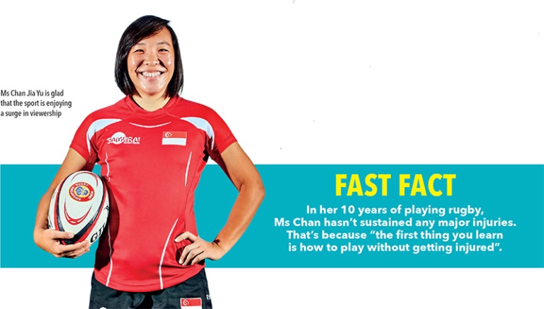 Between 9am and 5pm, you’ll find Ms Chan Jia Yu holed up in her office, where she works in digital marketing. But come Monday, Wednesday and Friday evenings, you’ll see the tanned 28-year-old charging for a rugby ball on the pitch. A member of the Blacks Rugby Football Club, Ms Chan is one of the local women’s rugby scene’s most prominent players.