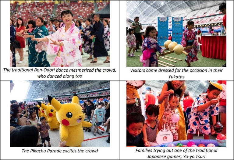 Visitors dressed in Yukatas started streaming into the National Stadium as soon as the door opened at 12pm. Visitors had an immersive experience in traditional and popular Japanese culture, through activities such as the Bon-Odori dance, musical stage performances, the Pokémon Carnival and Pikachu Dance Parade, as well as Yukata try-outs, among many more activities.