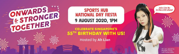 Singapore, 28 July 2020 – The Singapore Sports Hub is celebrating Singapore’s 55th birthday with a virtual twist to its annual National Day Fiesta. With a theme focused on progressing ‘Onwards & Stronger Together’, the 55-minute show will be broadcast on the Singapore Sports Hub’s YouTube channel at 1pm on 9 August, and will be hosted by Ah Lian, played by Michelle Chong, Left Profile Artiste.