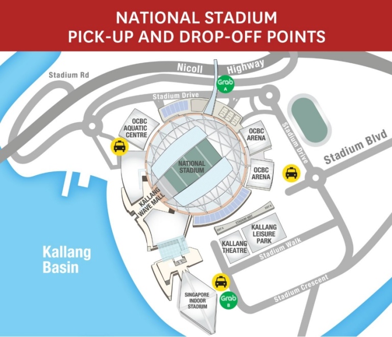 Patrons planning to take private hire vehicles (PHV) for exampleGrab to the National Stadium, should take note of the above-mentioned road closures and are advised to drop off at Grab pick-up & dropoff point B in front of the Singapore Indoor Stadium *Grab pick-up & drop-off points map in Annex B.