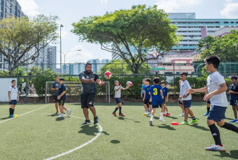 Photo Caption: Pauliasi Manu from Sunwolves interacting with the children at the Sembawang Primary School at their rugby training session this afternoon.